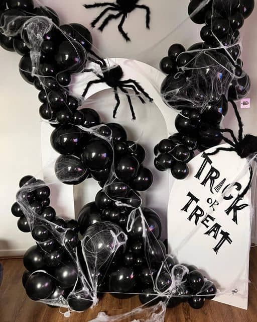 Zanurz się w klimacie grozy z naszą ekskluzywną aranżacją Total Black Halloween – idealną dekoracją na imprezy, sesje zdjęciowe i eventy tematyczne. Czarne balony tworzą efektowną ramę, oplecioną pajęczynami i ozdobioną gigantycznymi pająkami, które dodają scenografii dramatyzmu i tajemniczości. Całość dopełnia stylowy napis „Trick or Treat”, który przyciąga wzrok i podkreśla halloweenowy charakter dekoracji.