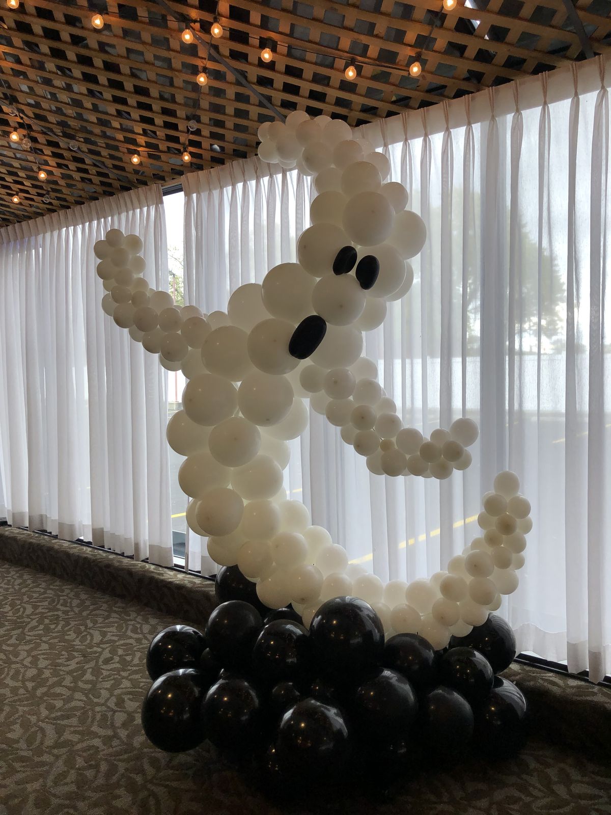 - 👻 Unikalny design: Ręcznie wykonana kompozycja z balonów w kształcie duszka z czarnymi oczami i ustami.
